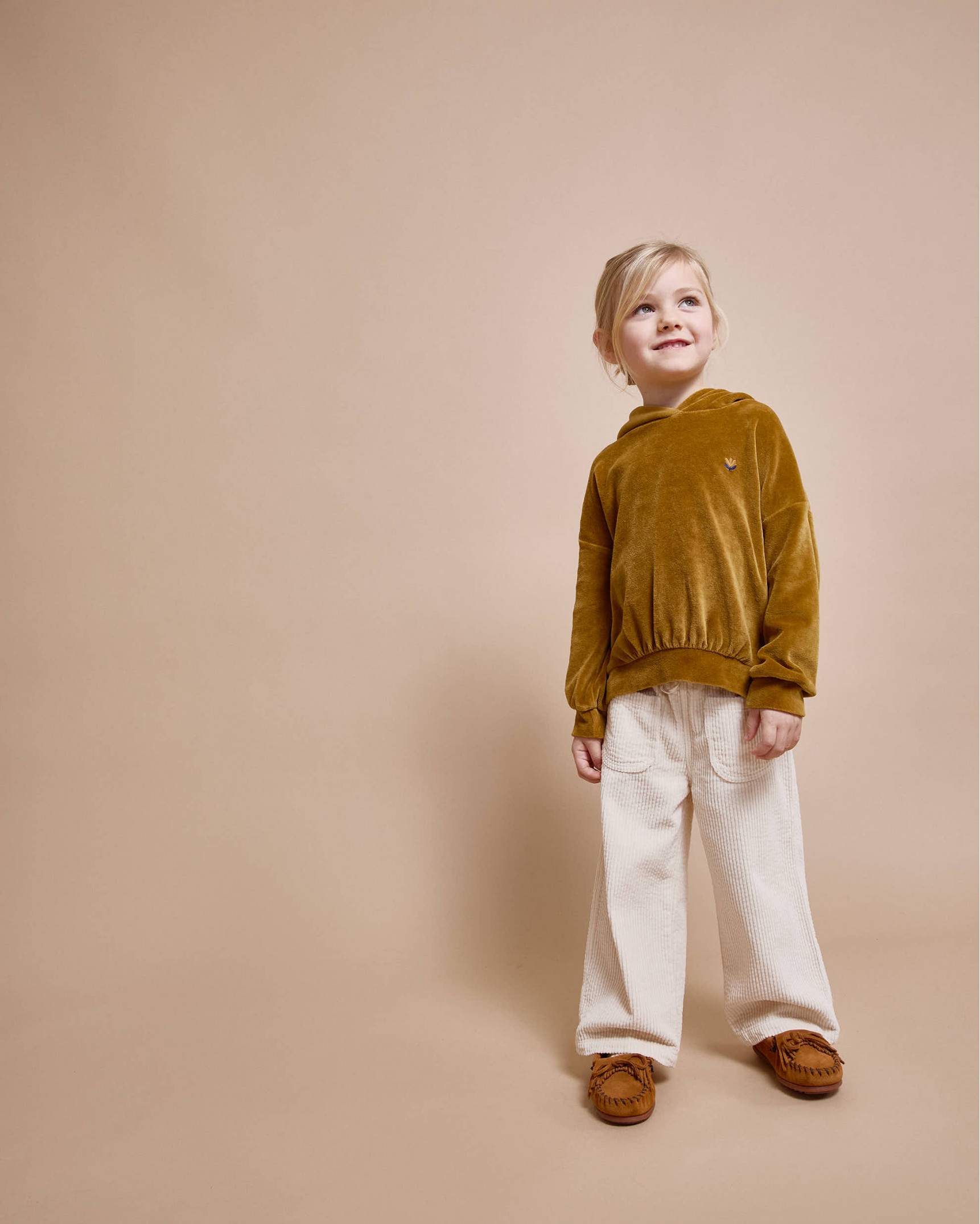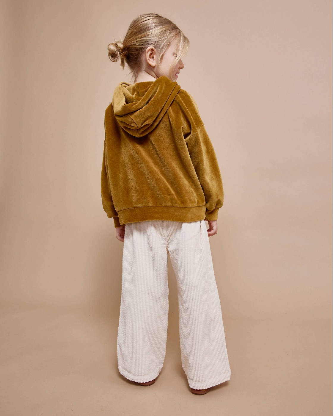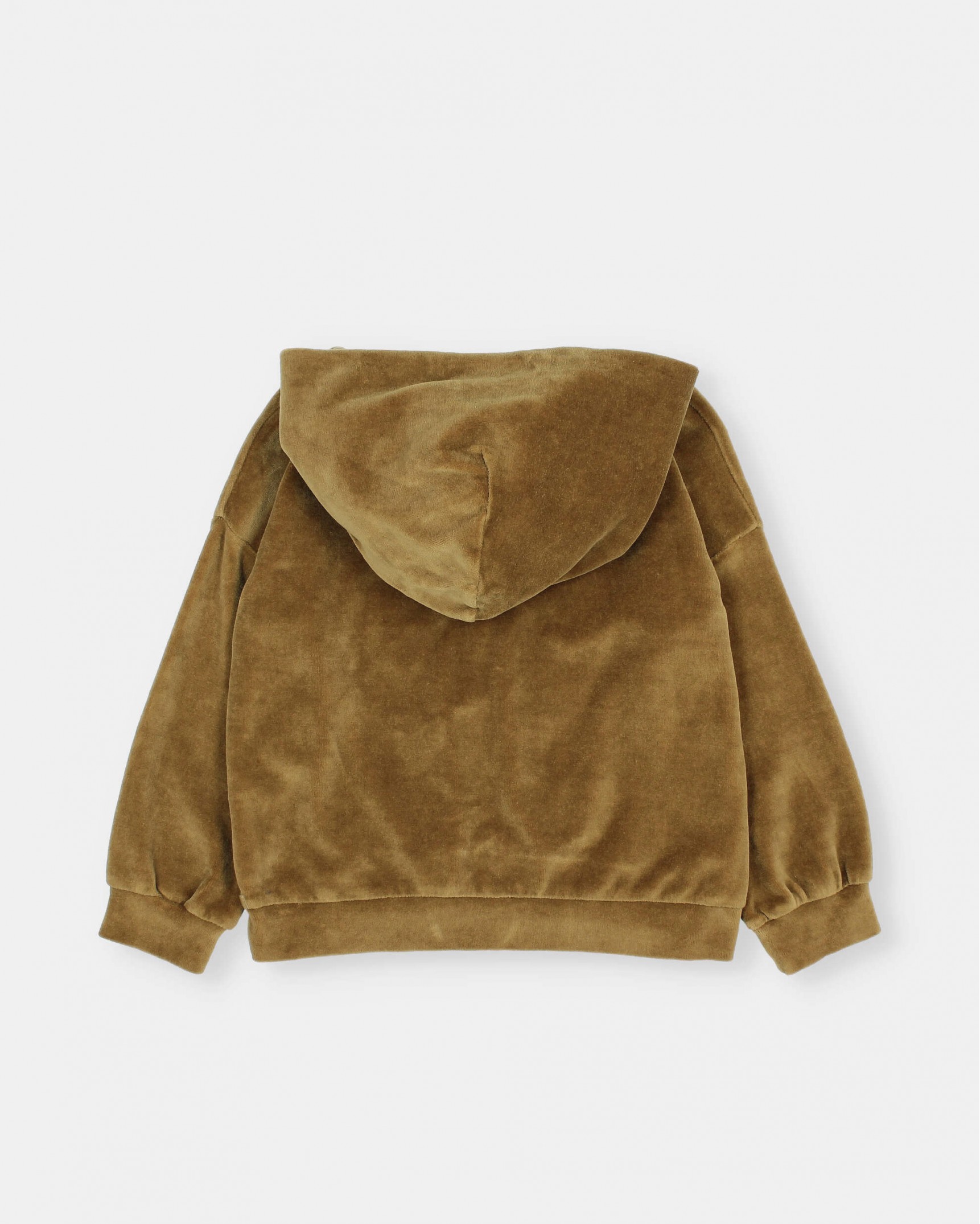 Sudadera de terciopelo elástico con capucha. Detalle flor bordado en el pecho. Bajo y puños con fruncido.