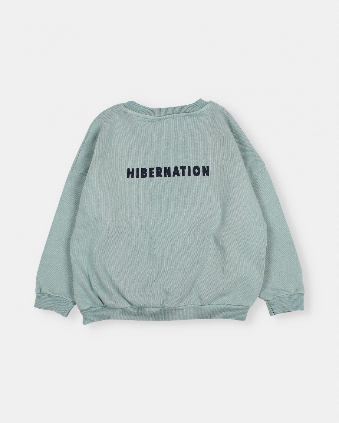Sudadera de felpa suave. Motivo oso estampado en el pecho. Estampado "hibernation" en la espalda. Cuello redondo. Etiqueta tab en el bajo. Acabados acanalados.